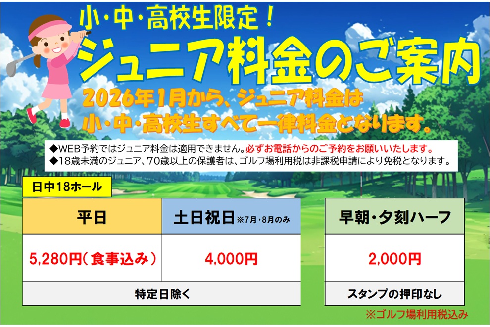 2026年1月より、ジュニア料金が小学生・中学生・高校生すべて一律料金となります。ご予約はお電話のみとなりますので、ご注意ください。※Web予約不可対象者 : 小中高校生*大人1名様につきジュニア3名様まで*小学生・中学生は保護者必須*18歳未満のジュニアと70歳以上の方は利用税免税の申請で非課税となります 料金はを添付画像をクリックしてご参照下さい。